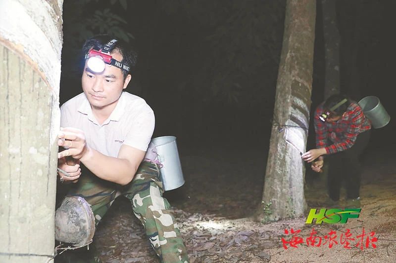 4月21日,十六队“85后”胶工张健,载着今年刚加入割胶队伍的妻子蒲金华到胶园割胶。两人腰间拴上铁盒,戴上头灯,备齐割胶工具,一“老”一“新”结伴同行,在漆黑的胶林中相互照应。