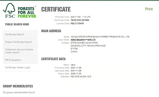 2021年11月30日,海南农垦宝橡林产集团股份有限公司(以下简称宝橡林产集团)下属子公司海南农垦宝联林产有限公司(以下简称宝联公司)通过FSC森林体系认证,顺利获得FSC-COC产业监管链认证证书。