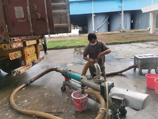 金福橡胶加工分公司员工正在装运浓乳。